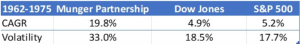 Volatility and risk, in the realm of investing, are intricately woven into the fabric of the financial markets. Much like George Soros’ perception of market reflexivity, where the actions of market participants influence the fundamentals, volatility is a reflection of the collective psyche of the investor community. It embodies the ever-changing moods, sentiments, and expectations of the market. However, with volatility comes risk—the uncertainty of returns. But as Soros would likely opine, it is within this very uncertainty that opportunities are born. For the astute investor, understanding and harnessing volatility, rather than fearing it, can lead to the potential for remarkable gains. It is a dance with chaos, where the rhythm of the market if correctly interpreted, can lead to a symphony of success. Between 1962 and 1975, Charlie Munger’s partnership returns were highly volatile but it beat the index by 3x with a volatility of 2x. It also had two back-to-back years in 1973 and 1974 where it had over 30% negative returns each year and underperformed the index but then recovered in the third year.